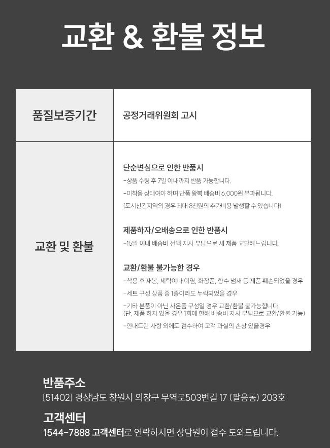 - 동일 상품의 컬러, 사이즈 등 옵션 교환을 원칙으로 하며 타 상품 교환은 환불 후 재구매로 정의한다. 교환의 경우 구매 회원이 왕복 배송비를 부담한다.